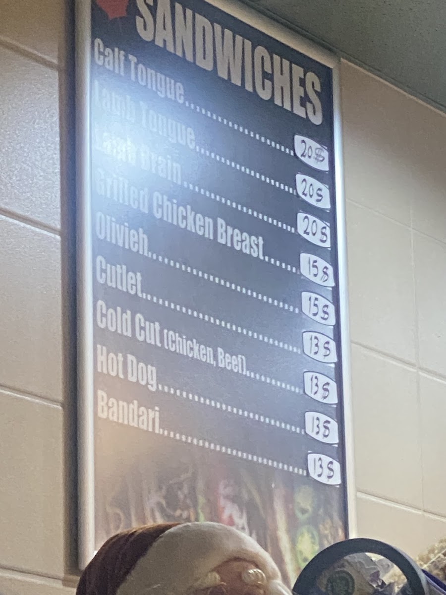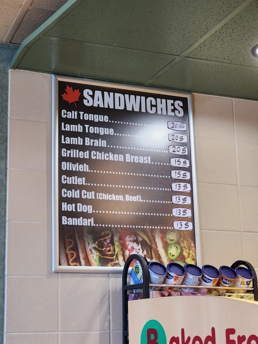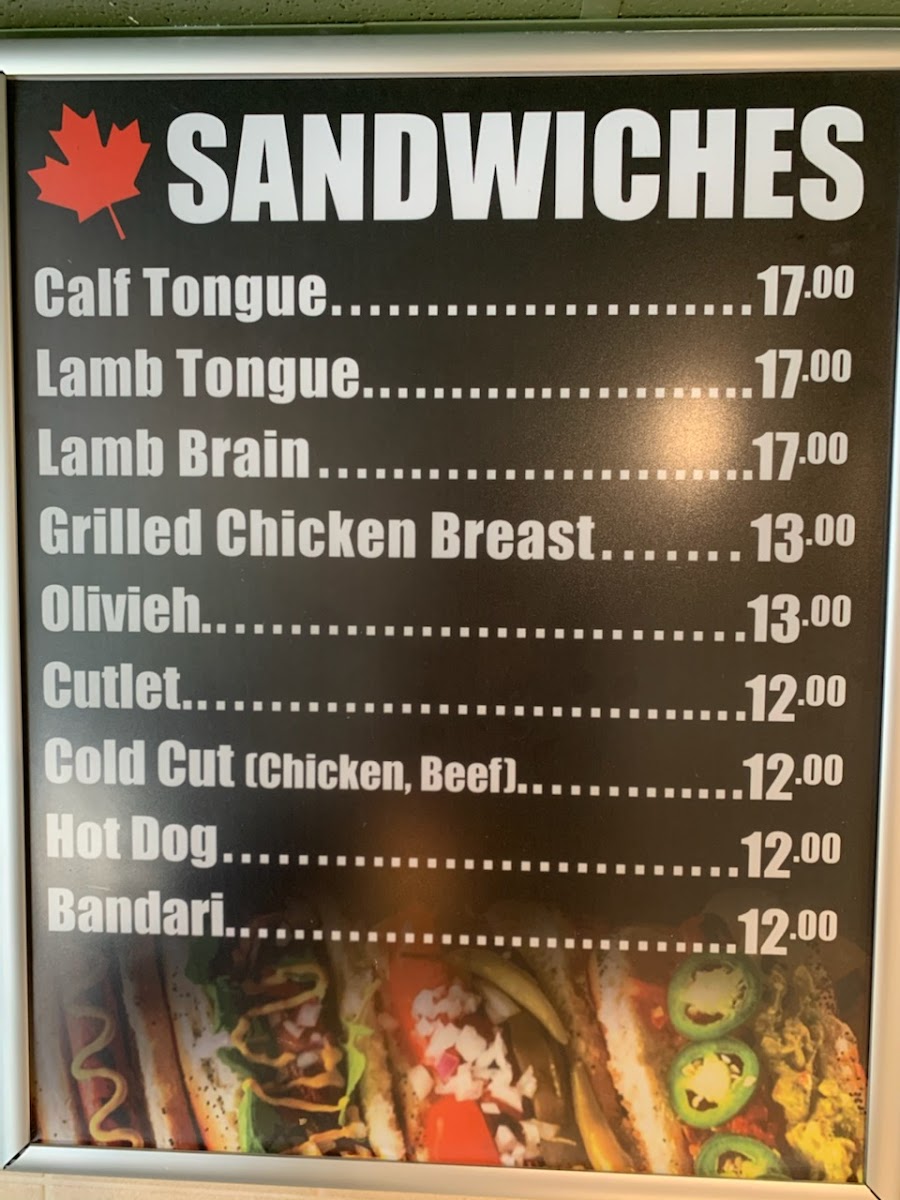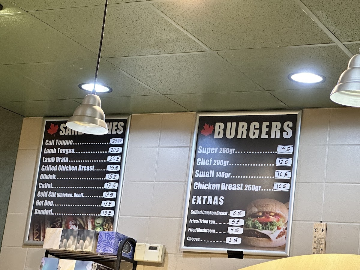 Highlights include generously portioned burgers, from classic chicken breast options to the signature Chef and Super Burgers, each layered with fresh lettuce, tomato, pickles, and the kitchen’s special sauce. Beyond burgers, the menu features a variety of Persian-inspired sandwiches, including lamb tongue and brain combinations, as well as cold cut selections that add a unique touch to everyday fast food.